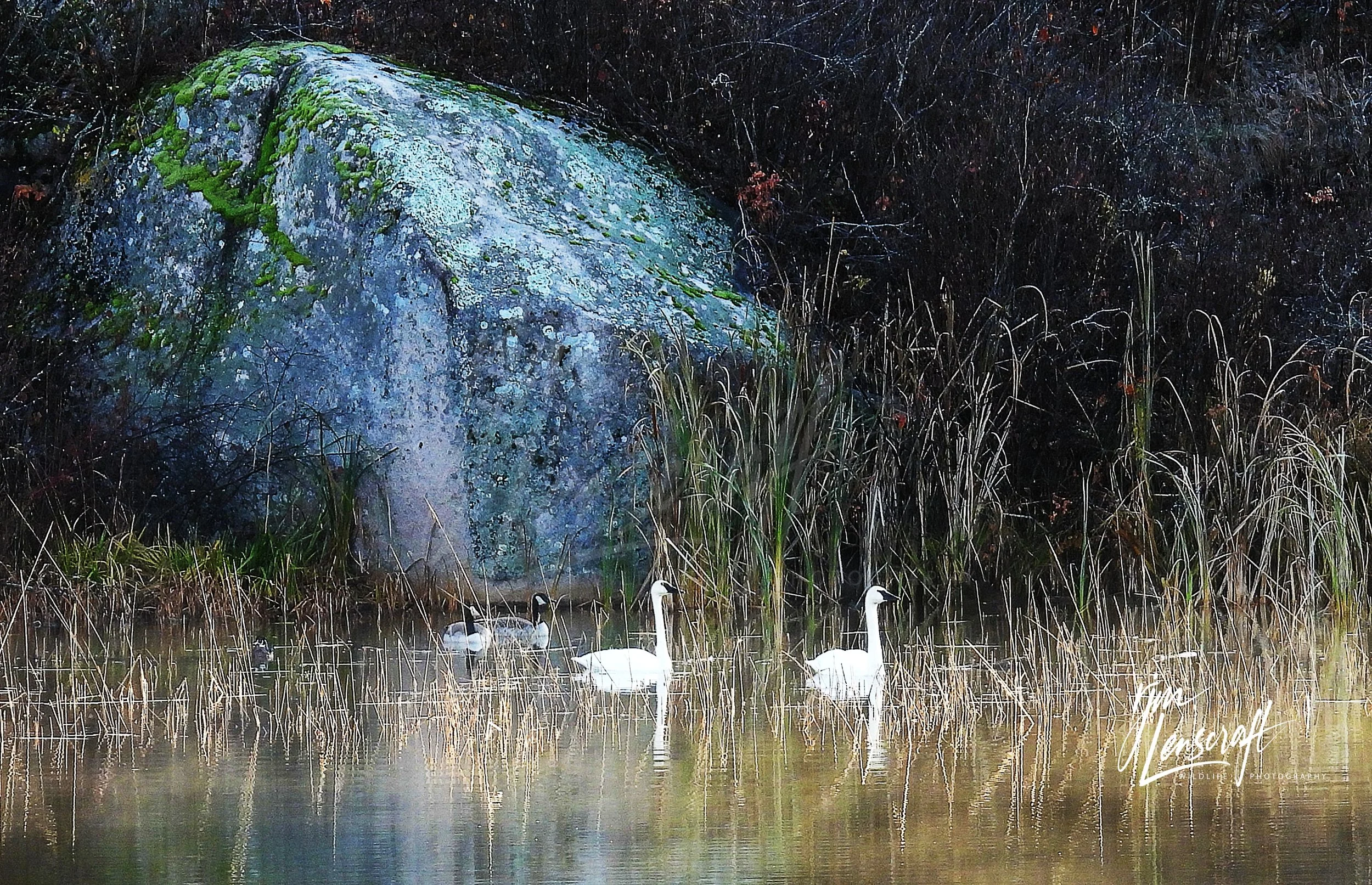 A pair of Trumpeter Swans dwarf a pair of Canada Geese in the shadows of the well known huge granite boulder near Coca Cola Falls in Pinawa Bay.
