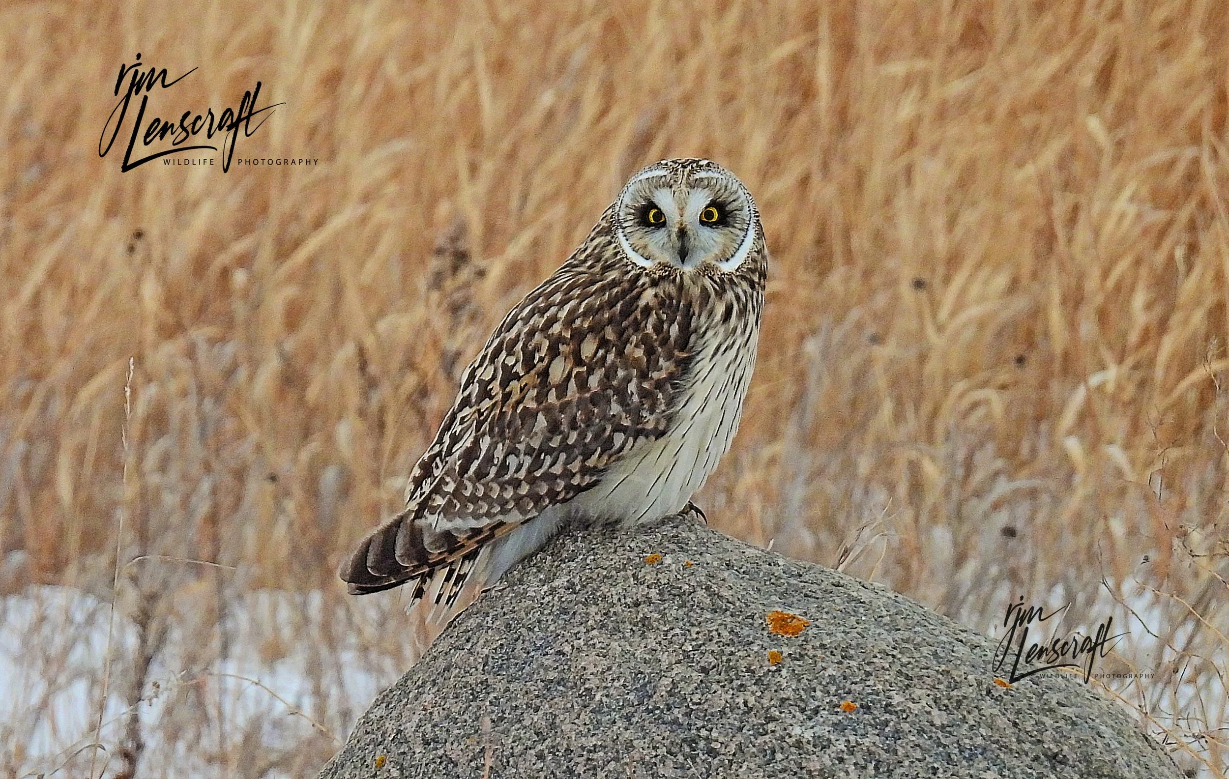 A Short Eared Owl sits on a large rock on the edge of a marsh, grabbing a quick rest before continuing its search for food. Photo taken in Oak Hammock Marsh north of Winnipeg.